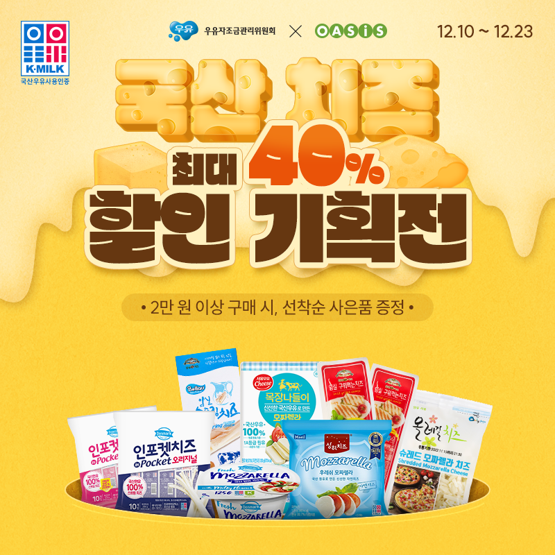 국산치즈 할인 기획전 안내 페이지 정보 목록 답변 본문 http://pages.coupang.com/p/134551?sourceType=oms_share&src=1234123&spec=12341234&addtag=600&ctag=134551&lptag=0&itime=20241210100646&pageType=EVENTPAGE&pageValue=134551&wPcid=17150558510564568547400&wRef=&wTime=20241210100646&redirect=landing&mcid=168053562c704d16a803794566ad1f78????우유자조금관리위원회, 연말 맞이 치~즈하세요!????‘국산 치즈 최대 40% 할인’ 기획전 실시 우유자조금관리위원회가 국산 우유 및 유제품의 신시장 판로 확대 지원사업의 일환으로‘국산 치즈’ 할인 기획전을 실시합니다. 이번 기획전은 소비자들이 가장 선호하는 식료품 온라인몰로 조사된 쿠팡과믿을 수 있는 바른 먹거리를 최저가로 제공하는 오아시스 마켓에서 각각 진행됩니다. 쿠팡과 오아시스 마켓이 함께하는 국산치즈 할인 기획전!건강한 국내산 원유로 만든 치즈, K-MILK 인증 마크를 확인하세요 ???? 이전글국산치즈 할인 기획전 안내 24.12.16 다음글2024년 제주올레 걷기축제 참여 24.12.13
